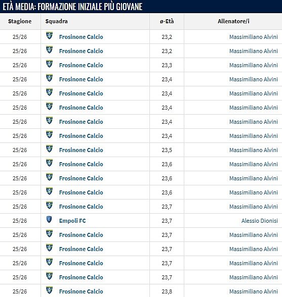 Tra questi, dati alla mano, c'è Massimiliano Alvini, che in quel di Frosinone ha creato una connessione che sembra essere diventata più spirituale che professionale. Attraverso Transfermarkt, per restare in tema, possiamo intercettare una statistica che non conosce aggettivi che non siano nettamente eloquenti. Alla voce “formazione iniziale più giovane” tra quelle schierate nel campionato di Serie B in corso, il monopolio ciociaro è evidente.