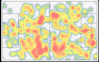 La sua heatmap (mappa di calore), è la rappresentazione visiva della sua centralità. Le zone colorate di rosso e giallo coprono praticamente ogni settore del campo, dal limite della propria area di rigore fino alla trequarti avversaria, passando per la zona nevralgica centrale.