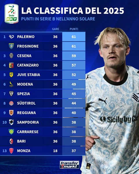 Serie B, la classifica del 2025: Frosinone e Palermo in vetta nell’anno solare